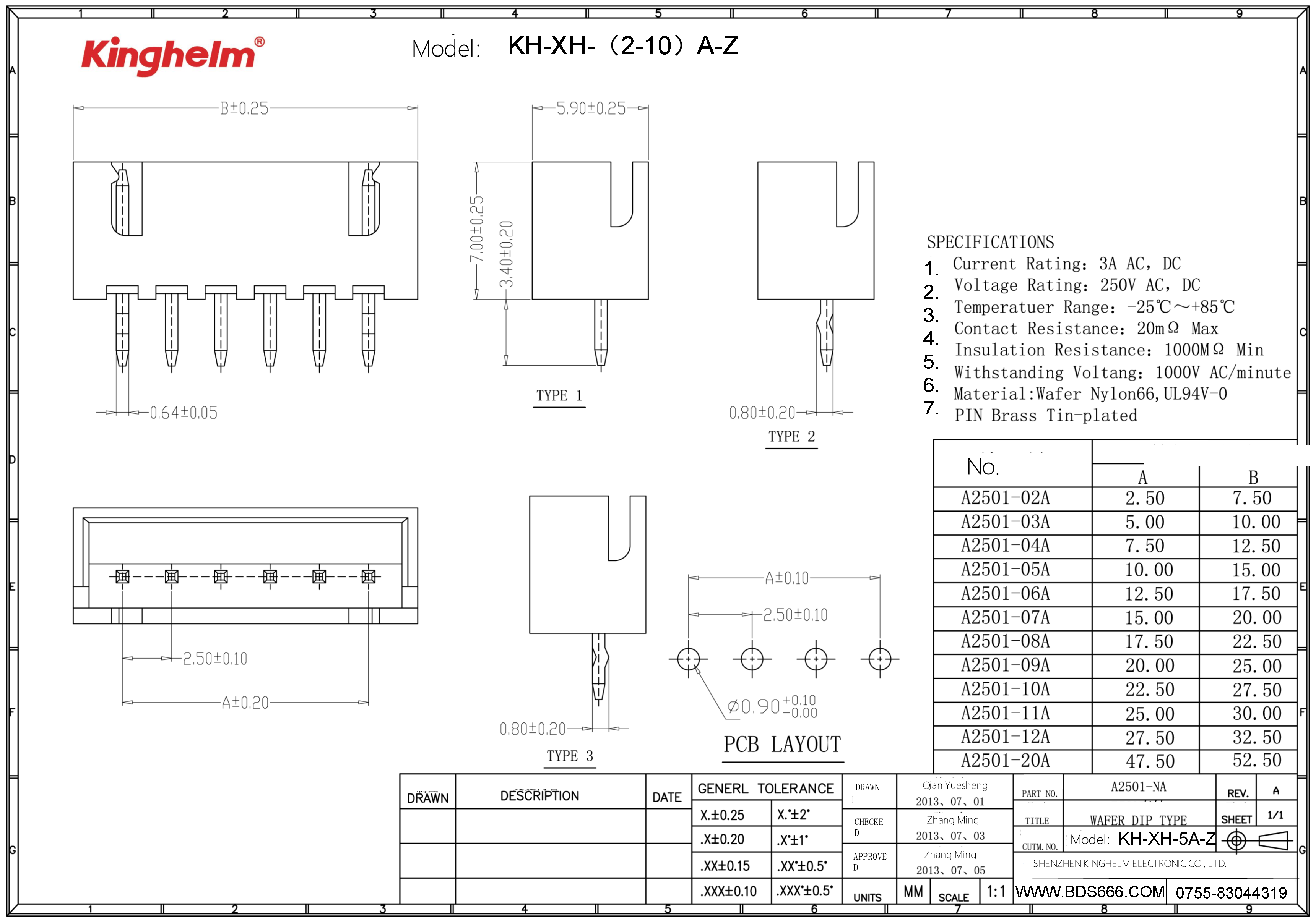 Wire to Board Connector, XH Connector, 2.5mm Pitch, 1x7P, KH-XH-7A-Z Product:KH-XH-7A-Z Category:XH Connector Specification:Pitch 2.54mm Type:Male Pin Mounting Style:Straight Rated Voltage/Current:3A Product:KH-XH-7A-Z Category:Connector Classification:Wire to Board Connector Type:Pitch: 2.5mm Mounting Style:XH Angle:DIP